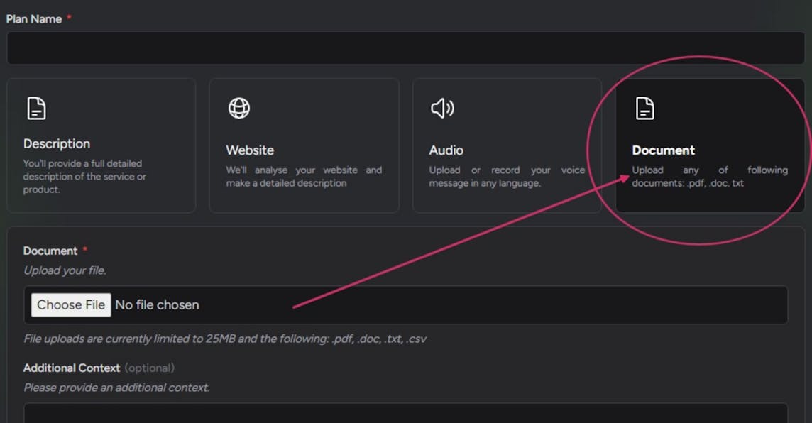 - Import From a Website or Description: Import all the info for a product or service using a website URL or add a custom description. You can also use a PDF or audio to give input to FranknAI.